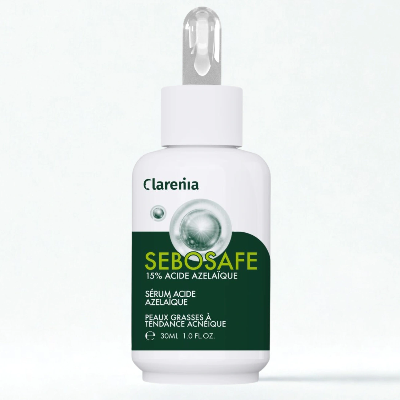 Le sérum Clarenia SeboSafe Azélaïque est formulé avec 15% d’acide azélaïque, reconnu pour son efficacité sur les peaux grasses à tendance acnéique. Grâce à ses propriétés antibactériennes, kératolytiques et anti-inflammatoires, il réduit les imperfections, régule l’excès de sébum et favorise l’atténuation des marques post-acné et taches pigmentaires. Dès 7 jours, la peau paraît plus lisse, le grain de peau est affiné et les marques s’estompent progressivement. Sa tolérance élevée en fait un soin adapté même aux peaux sensibles.